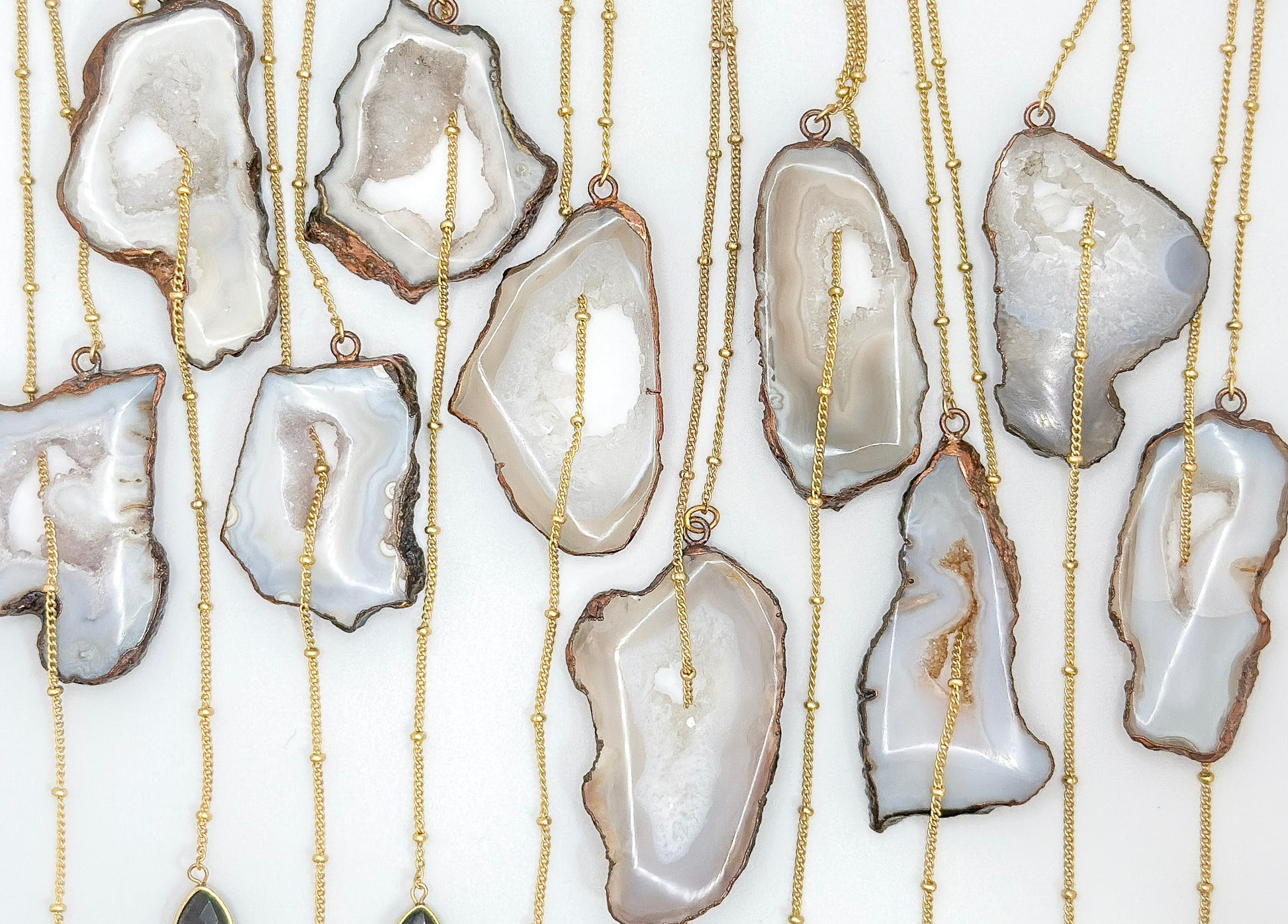 The agate and onyx pendant is a powerful statement piece that combines bold design with natural allure. Featuring a stunning slice of agate, its moody tones and unique patterns make each necklace distinct. Paired with a sleek onyx teardrop, this pendant delivers an expert blend of sophistication and edge for a truly striking look.