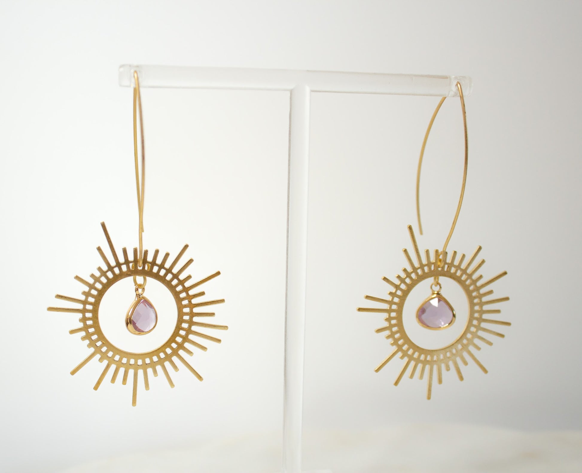 These fabulous earrings boast of a bold sunburst, encircling a faceted glass gem of lovely lilac. Serene yet fun, these earrings are compliment worthy and eye catching.