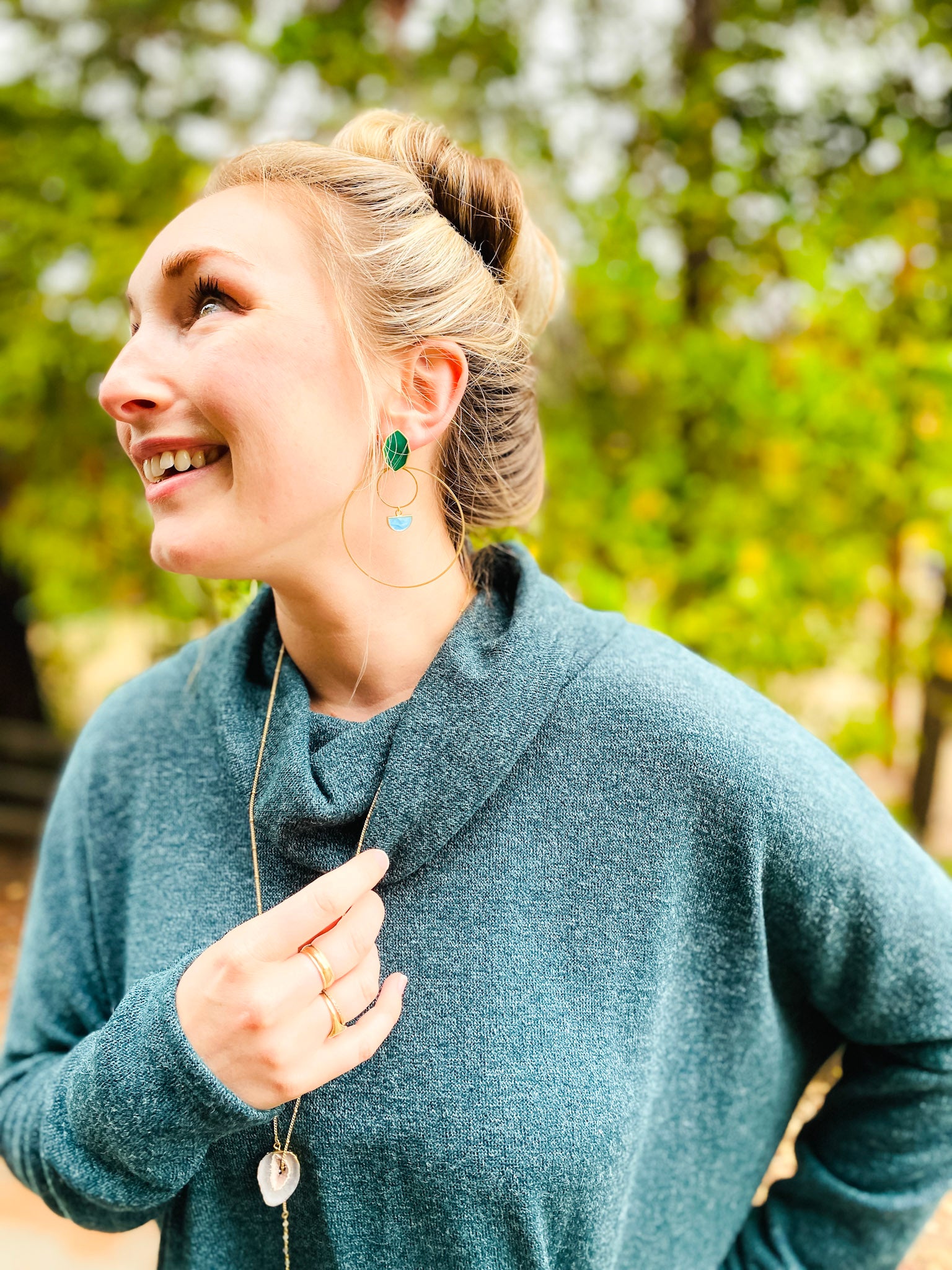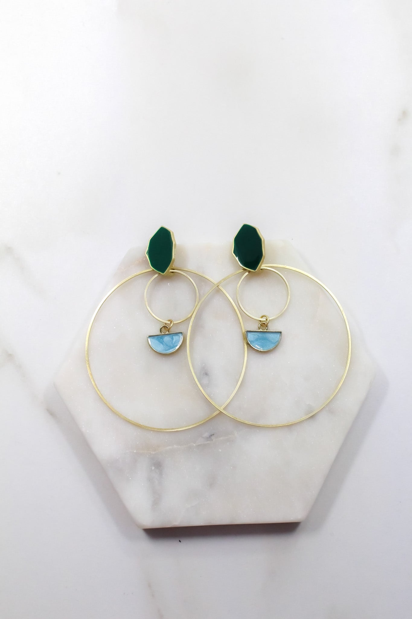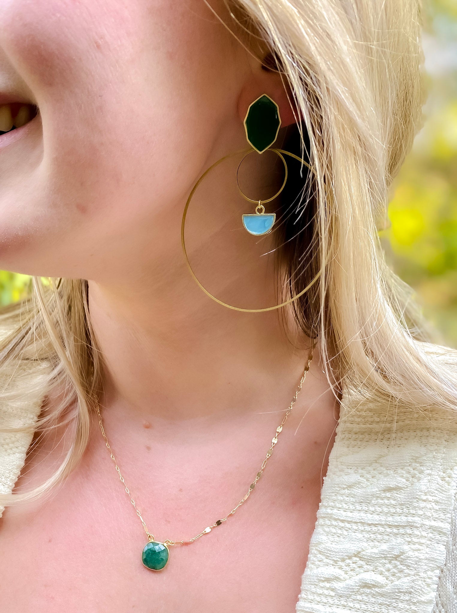 These dramatic hoops are calling your name! Designed with an pointed enamel emerald post and fun little turquoise half circles, these double hoops could bring enough drama for an evening out or casual enough for a lazy afternoon.