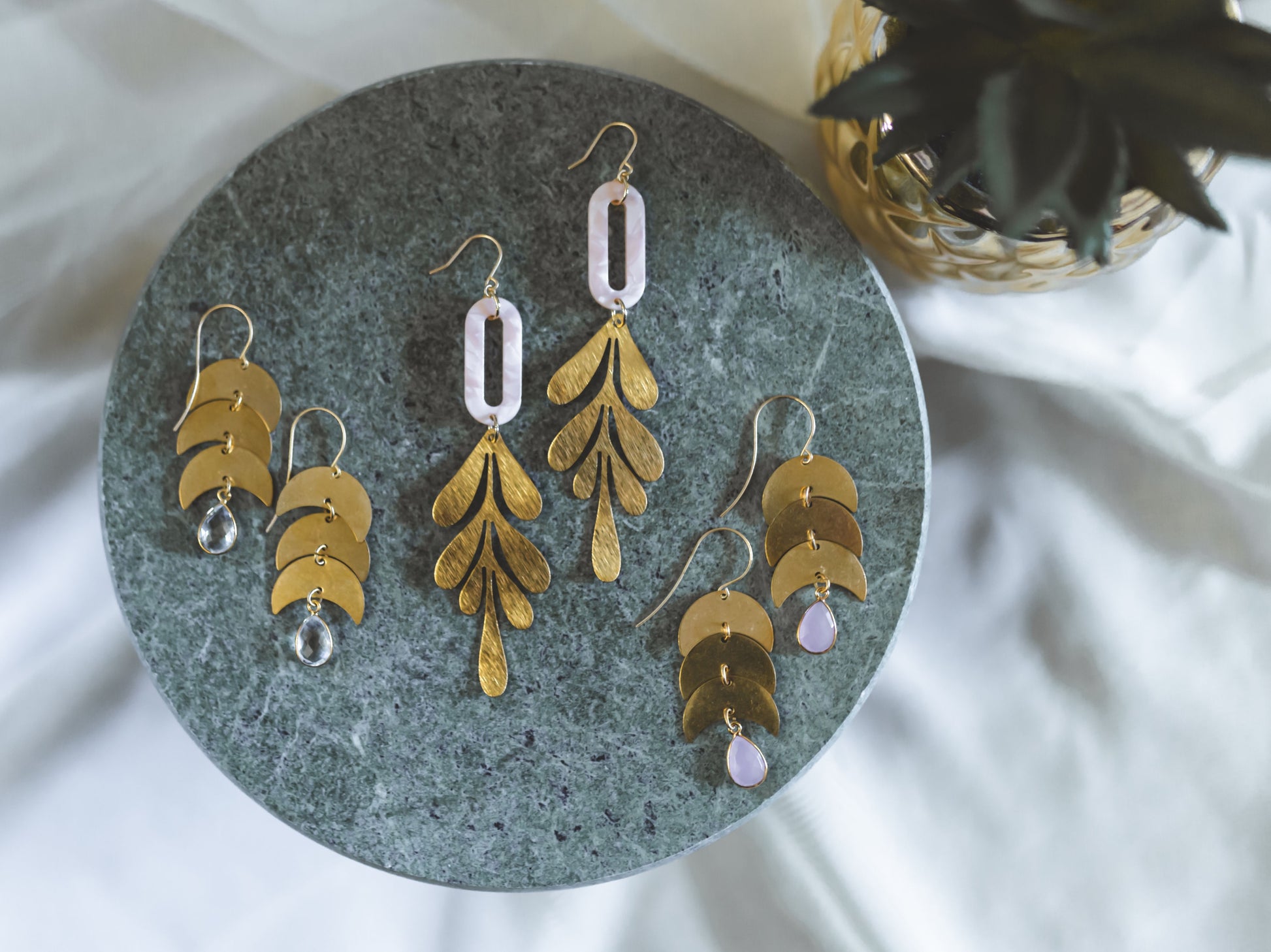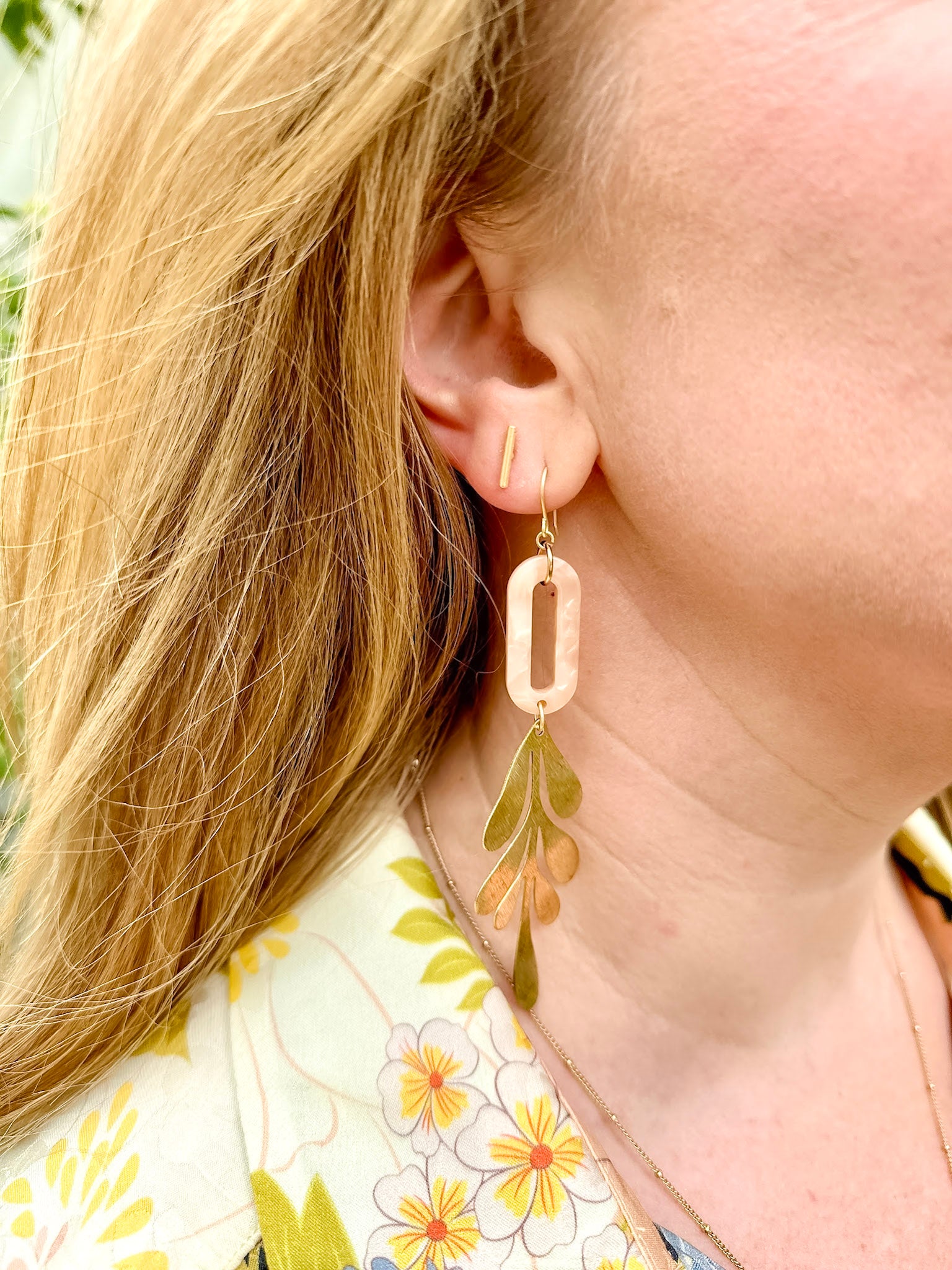 Pink Leaf earrings feature acrylic oval piece, unique textured brass leaf shape, and gold plated components.